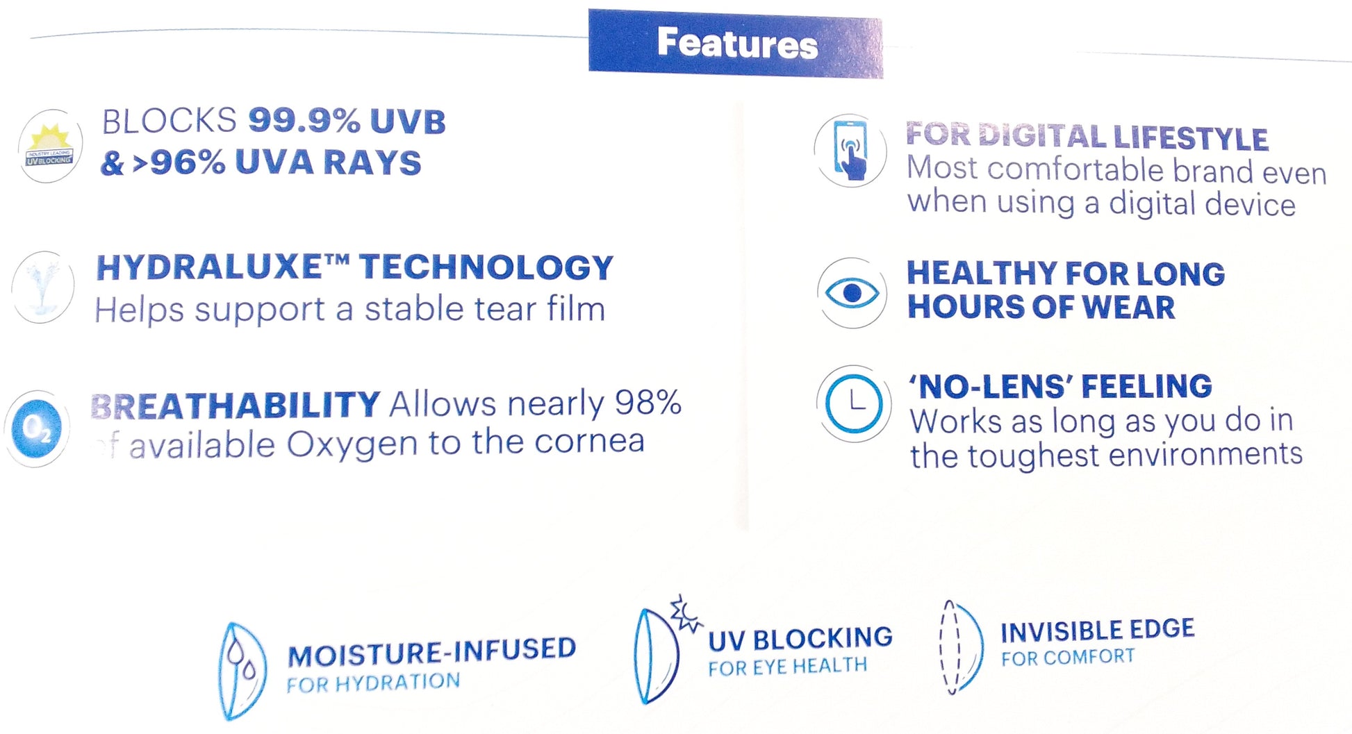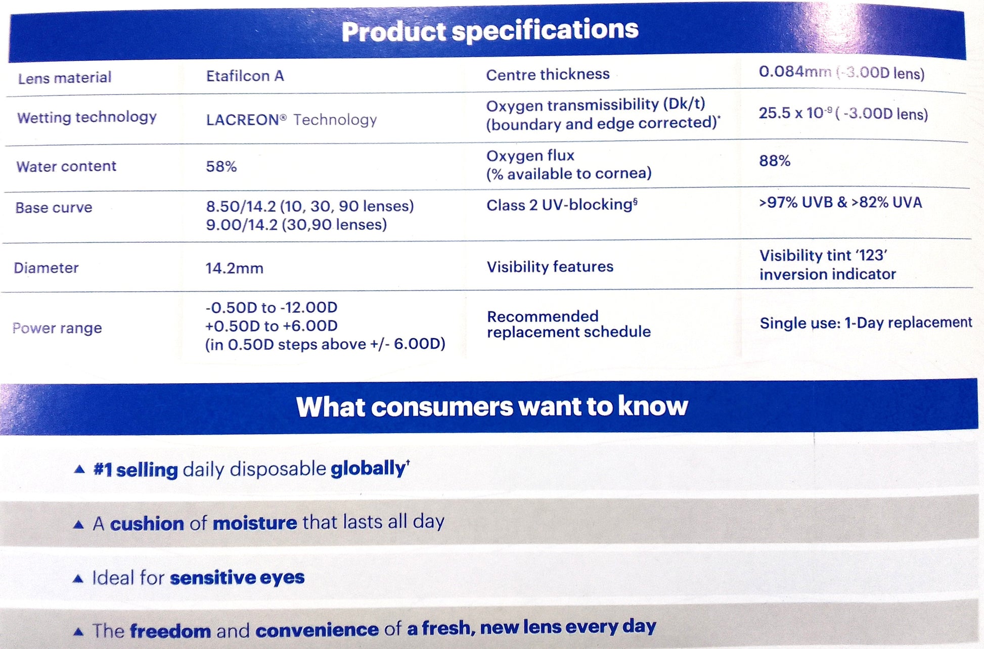 Material - etafilcon A, Water 58%, Thickness 0.090mm @-3.00D